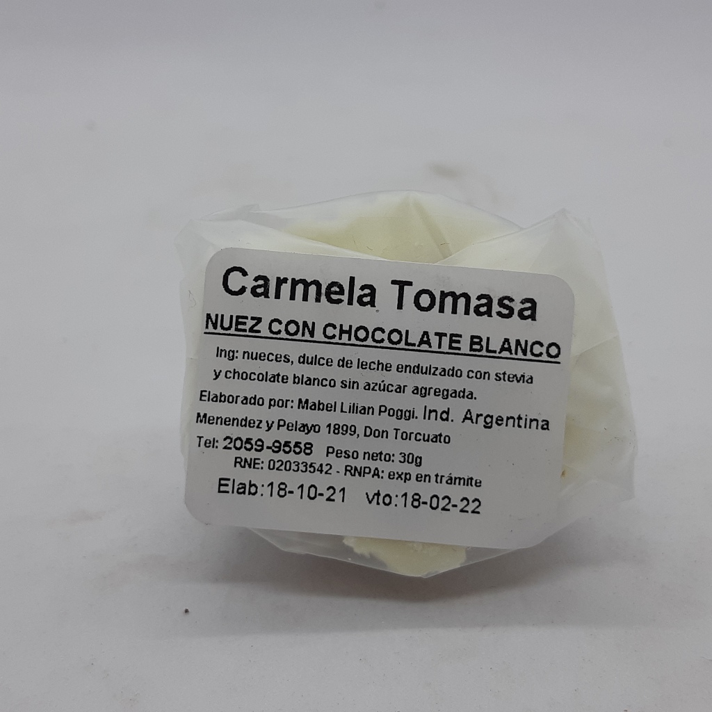 Nueces, bañadas, rellenas de dulce de leche y Sin Azúcar agregada.