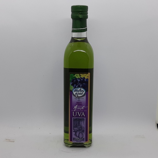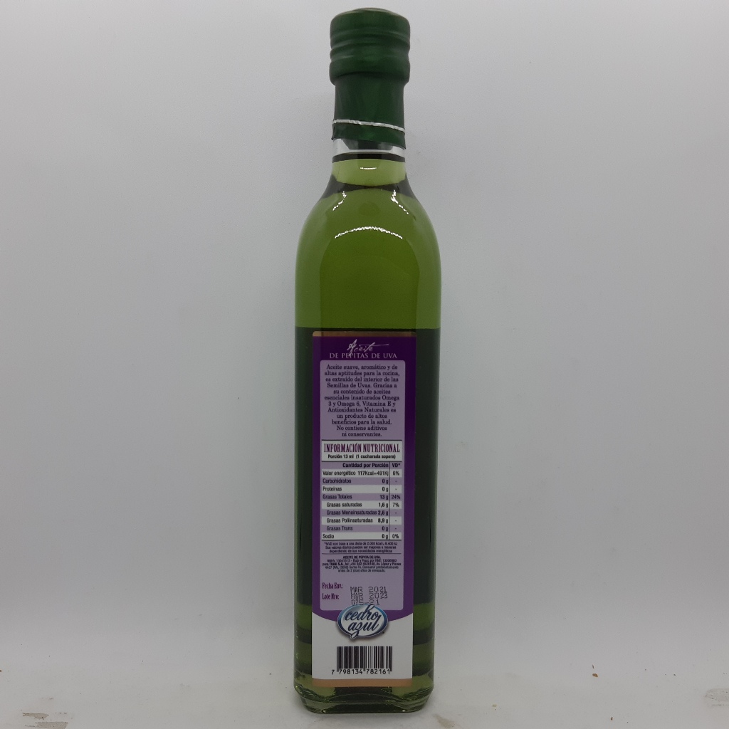 100% aceite de pepitas de uva. Apto para celíacos. Provee Vitamina E, Contiene Omega 3 y Omega 6 (en un 70% ), Gran resistencia a las altas temperaturas (punto de humo en los 230ºC).