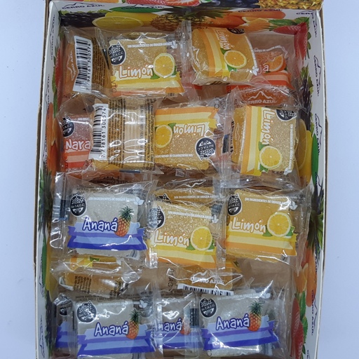 Bombones con sabor a frutas. Surtidos. Frutilla, Limón, Uva, Ananá y Mandarina.