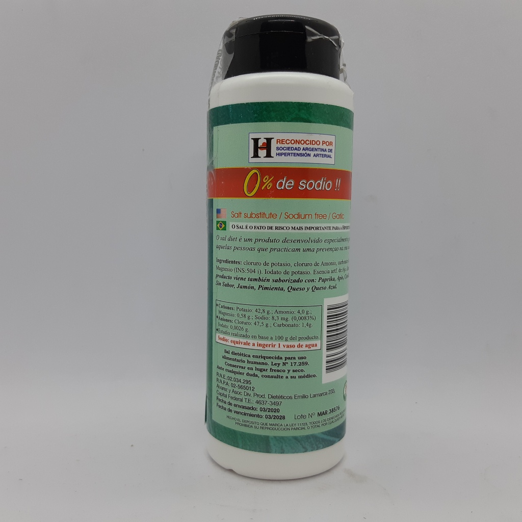 Sal dietética, con 0% de sodio, saborizada con ajo natural deshidratado.