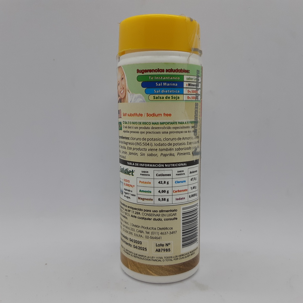 Sal dietética enriquecida por Ley N° 17.259, sin sodio, sabor a cebolla. Contiene certificación Kosher.