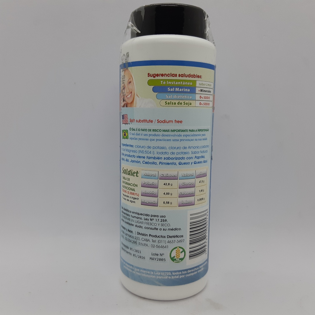 Sal dietética sin sodio, enriquecida por Ley N° 17.259. Contiene certificación Kosher.