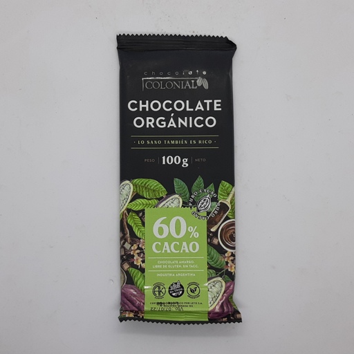 Chocolate amargo, libre de gluten. SIN TACC. Certificado orgánico por LETIS S.A.