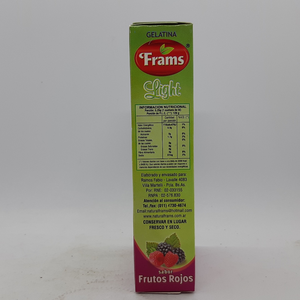 Polvo para preparar gelatina dietética de bajo contenido calórico, con sabor a Frutos Rojos artificialmente aromatizado. Libre de Gluten.