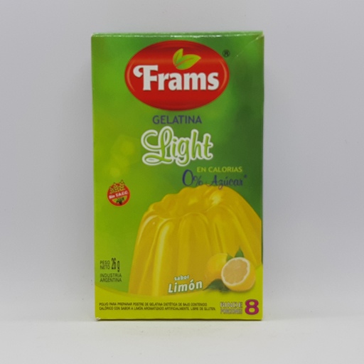 Polvo para preparar postre de gelatina dietética de bajo contenido calórico, con sabor a Limón aromatizado artificialmente. Libre de Gluten.