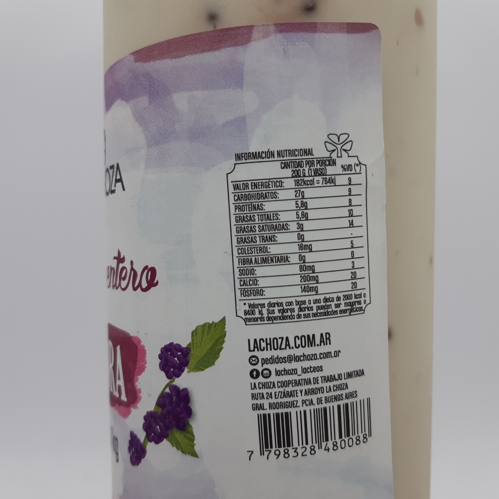 Composición: Leche fluida entera Pulpa de mora – Azúcar – Cultivos lácticos – Agar agar.