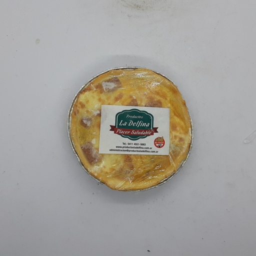 Masa de tarta con premezcla de harinas La Delfina rellena con jamón cocido y queso cremoso. 0% grasas trans. Presentada en plato de aluminio de 14 cm lista para consumir.