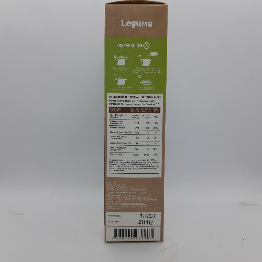 Pasta seca de harina de arvejas, arroz, kale y spirulina. Alto contenido de fibras, alto contenido de proteinas, vegano y bajo en sodio. SIN TACC