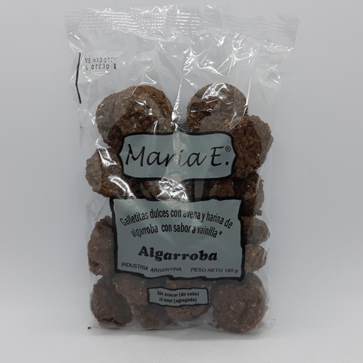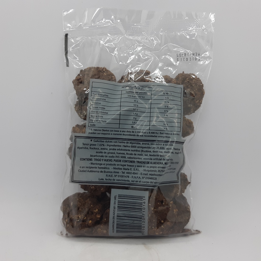 Galletitas dulces con harina de algarroba, avena y miel con sabor a vainilla.