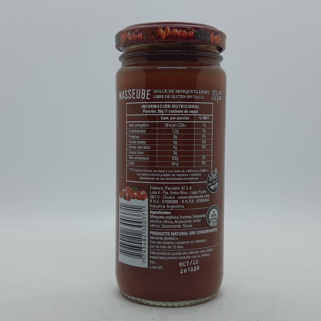 Mosqueta orgánica, fructosa, Espesante: pectina cítrica, Acidulante: ácido cítrico, Edulcorante: stevia.