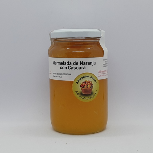 Mermelada de naranja con cáscara de elaboración artesanal con pulpa de frutas seleccionadas, sin conservantes, aromatizantes ni colorantes. Sin agregado de azúcar. Contiene fructosa, no apta para diabéticos.