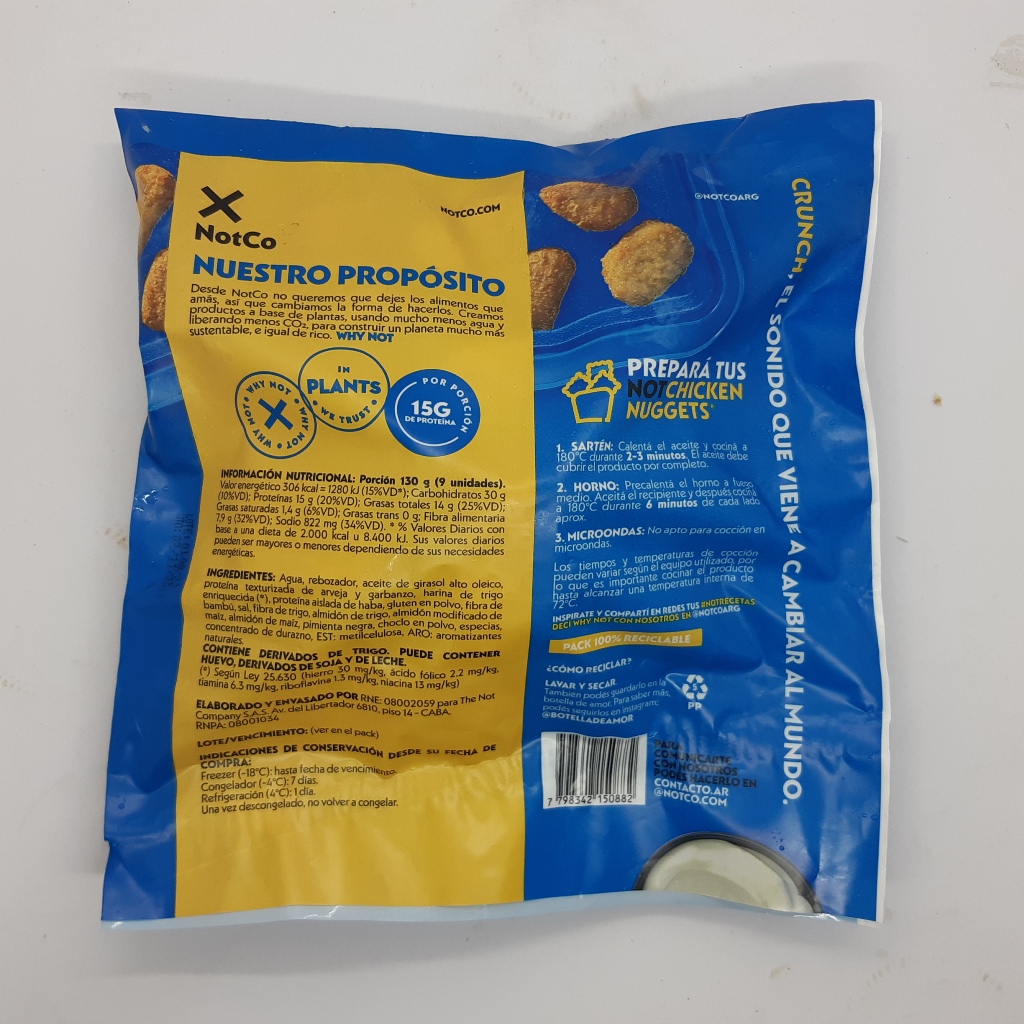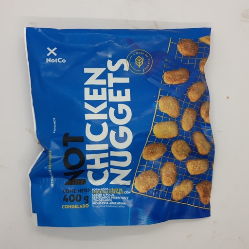 Ingredientes: Agua, rebozador, aceite de girasol alto oleico, proteína texturizada de arveja y garbanzo, harina de trigo enriquecida (*), proteína aislada de haba, gluten en polvo, fibra de bambú, sal, fibra de trigo, almidón de trigo, almidón modificado de maíz, almidón de maíz, pimienta negra, choclo en polvo, especias, concentrado de durazno, EST: metilcelulosa, ARO: aromatizantes naturales. CONTIENE DERIVADOS DE TRIGO. PUEDE CONTENER HUEVO, DERIVADOS DE SOJA Y DE LECHE.