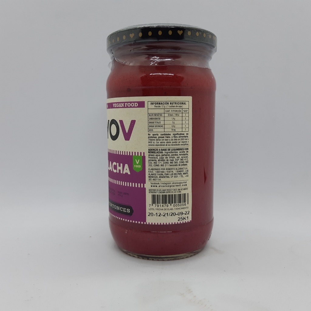 Ingredientes: aceite de girasol, agua, garbanzo, porotos, remolacha, mostaza, jugo de limón, sal, azúcar, pimienta, almidon de maíz. ESP INS 412, COL INS 171, CONS INS 385, CONS INS 202, CONS 211 benzoato de potasio.