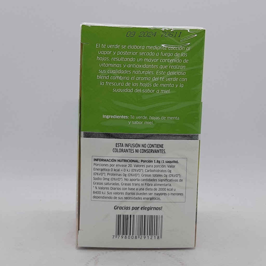 Este delicioso blend combina el aroma del té verde con la frescura de las hojas de menta y la suavidad del sabor a miel.