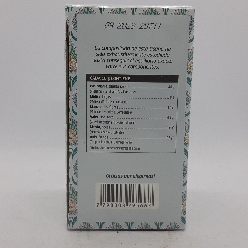 Ingredientes: Pasionaria, melisa, manzanilla, valeriana, menta y anís.