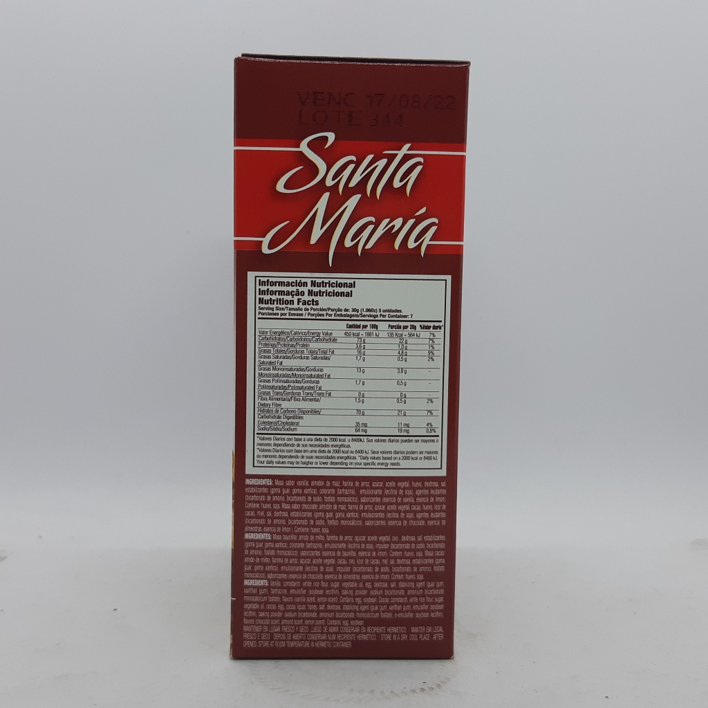 INGREDIENTES: Masa sabor vainilla: almidón de maíz, harina de rroz, acite vegatl, huevo, dextrosa, sal, estabilizantes ( goma guar, goma xántica), colorante (tartrazina), emulsionante (lecitina de soja), agentes leudantes (bicarbonato de amonio, bicarbonato de sodio, fosfato monocálcico), saborizantes (esencia de vainilla, esencia de vainilla). Contiene: huevo, soja. Masa sabor chocolate: almidon de maiz, harina de arroz, azucar, aceite vegetal, cacao, huevo, licor de cacao, miel, sal, dextrosa, estabilizantes (goma guar, goma xántica), emulsionantes ((lecitina de soja), agentes leudantes (bicarbonato de amonio, bicarbonato de sodio, fosfato monocálcico), saborizantes (esencia de chocolate, esencia de almendras, esencia de limon). Contiene: huevo, soja.