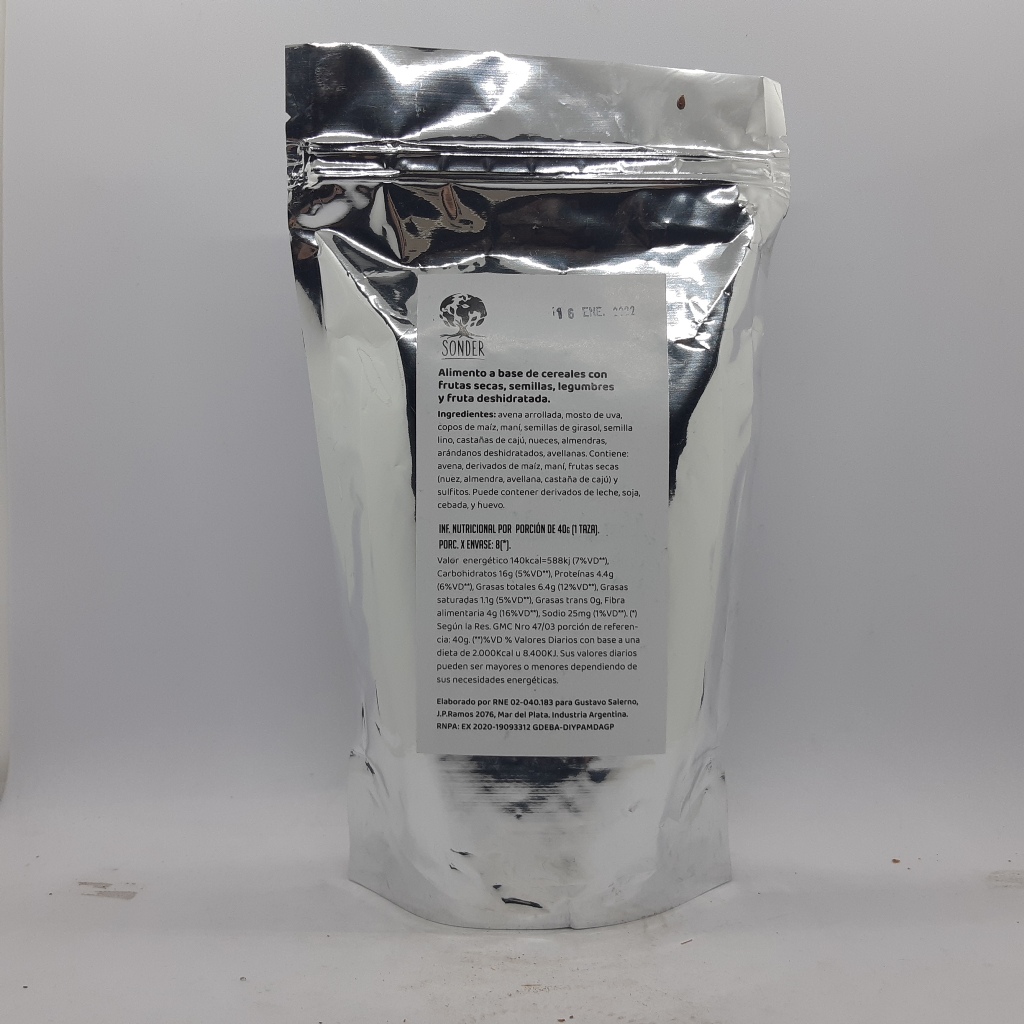 CONTIENE: ALMENDRA, AVELLANA, NUEZ, CASTAÑA DE CAJÚ, CRANBERRIES, COPOS, AVENA, MANÍ, SEMILLAS DE GIRASOL Y SEMILLAS DE LINO.