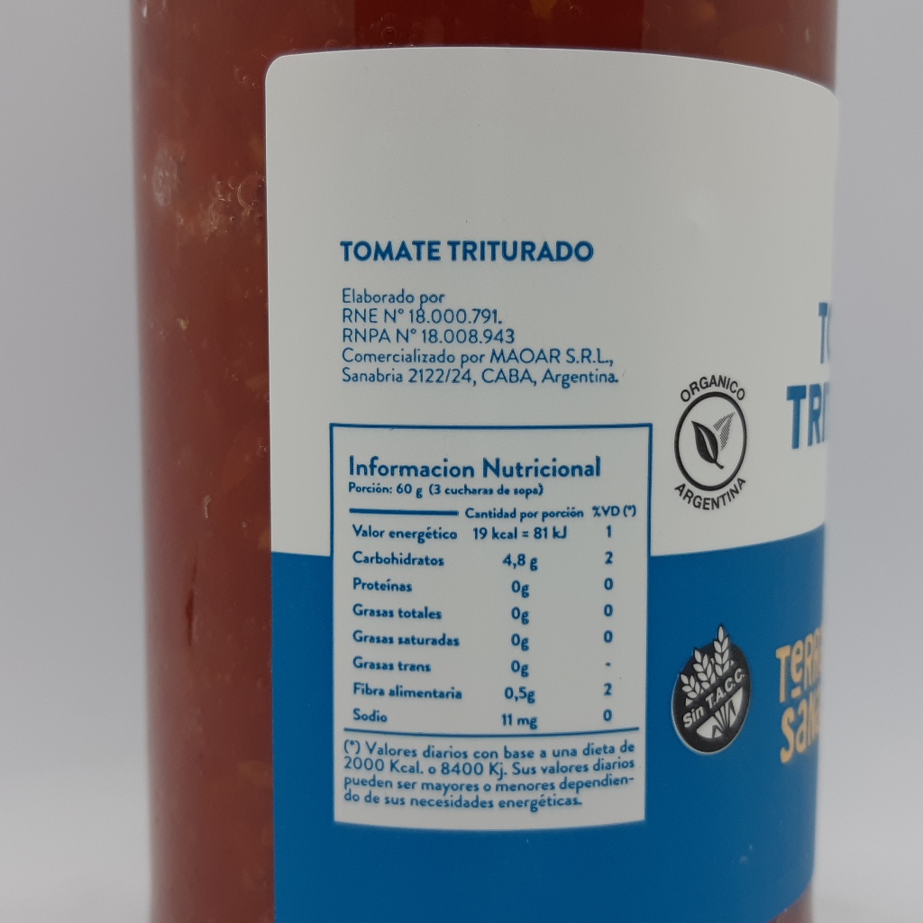 Elaborada artesanalmente con tomates orgánicos seleccionados en forma manual y cultivados en un ambiente ecológico, libre de fertilizantes, herbicidas e insecticidas químicos. Una alternativa 100% natural a las salsas de tomate convencionales, sin agregados de sodio.