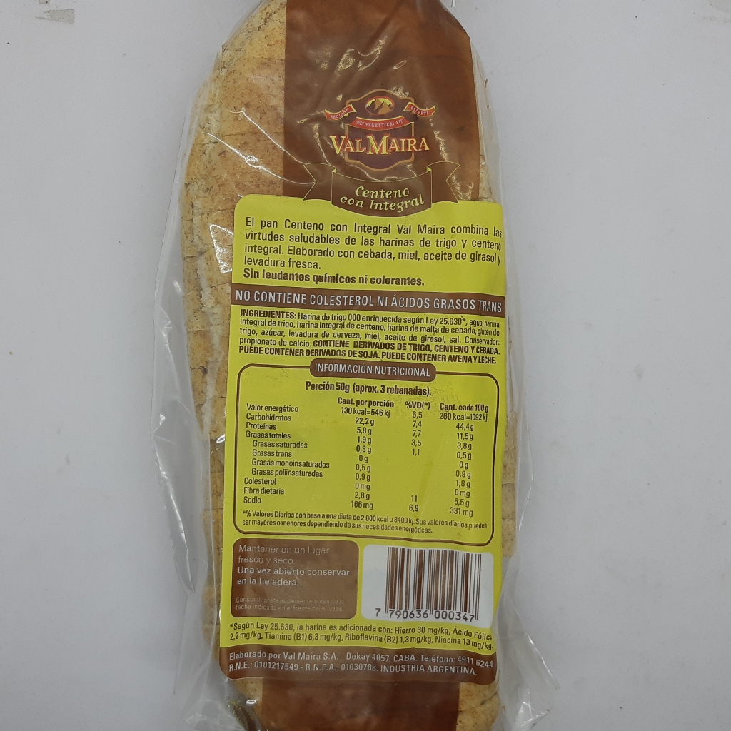 Centeno integral, trigo integral, harina de trigo 000, gluten de trigo, levadura, aceite de girasol,