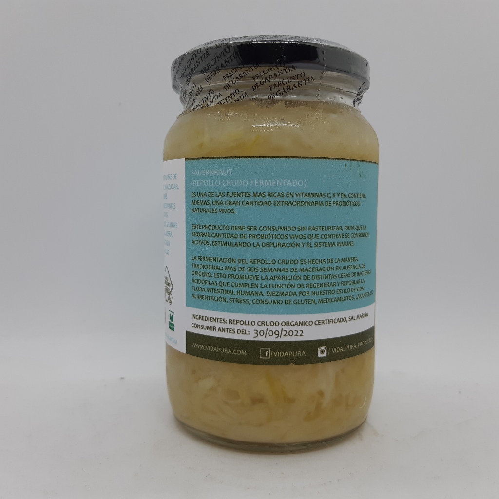 Sauerkraut o Chucrut vivo elaborado con repollo orgánico certificado y sal marina.